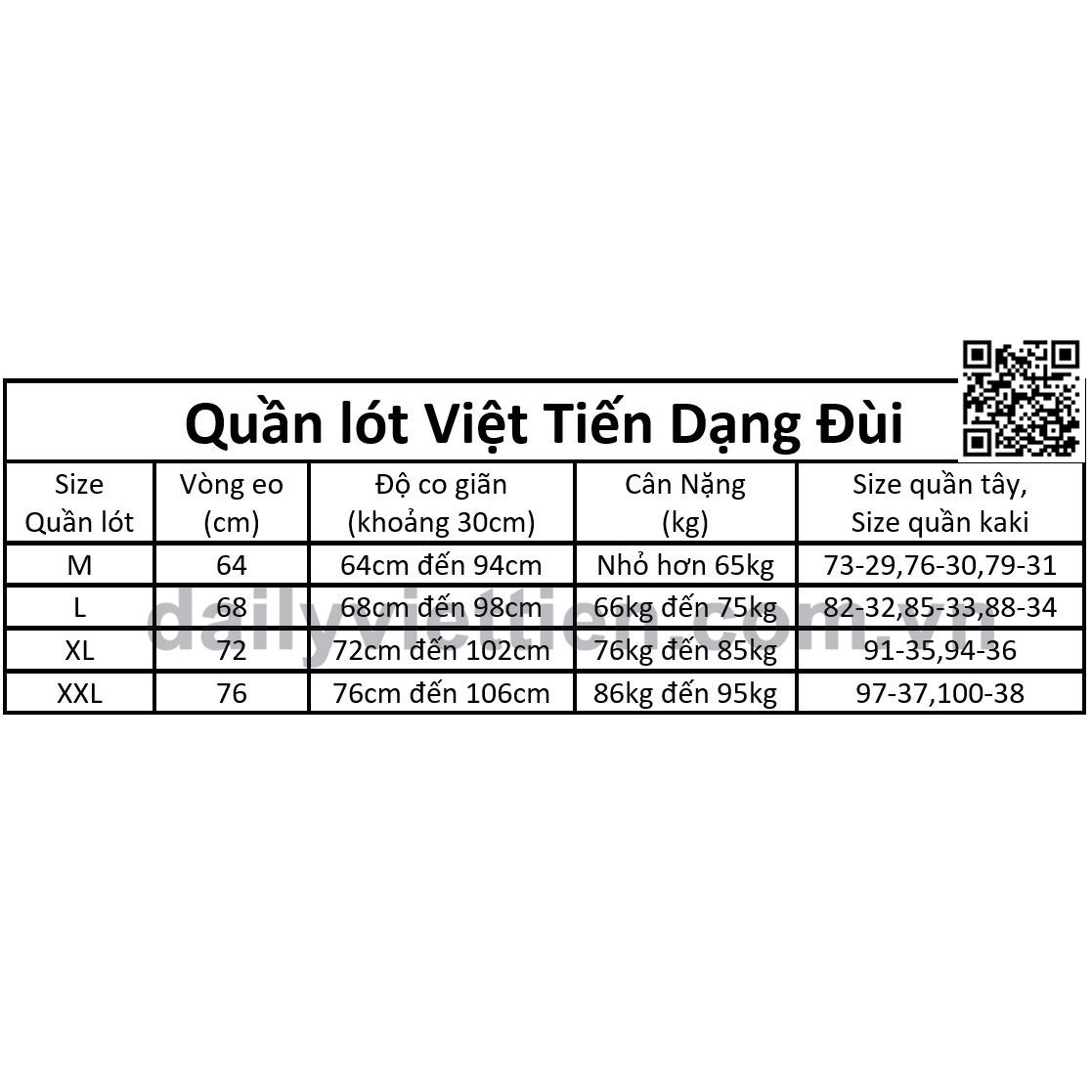 Quý khách được MIỄN PHÍ GIAO HÀNG khi mua từ 2 quần lót Đùi Việt Tiến Boxer màu Xám Grey số 593 hoặc mua cùng sản phẩm khác. Quý khách xem hình để chọn size quần phù hợp từ size M đến XXL, nếu muốn mặc rộng hoặc mua cho người lớn tuổi có thể tăng lên 1 size.
