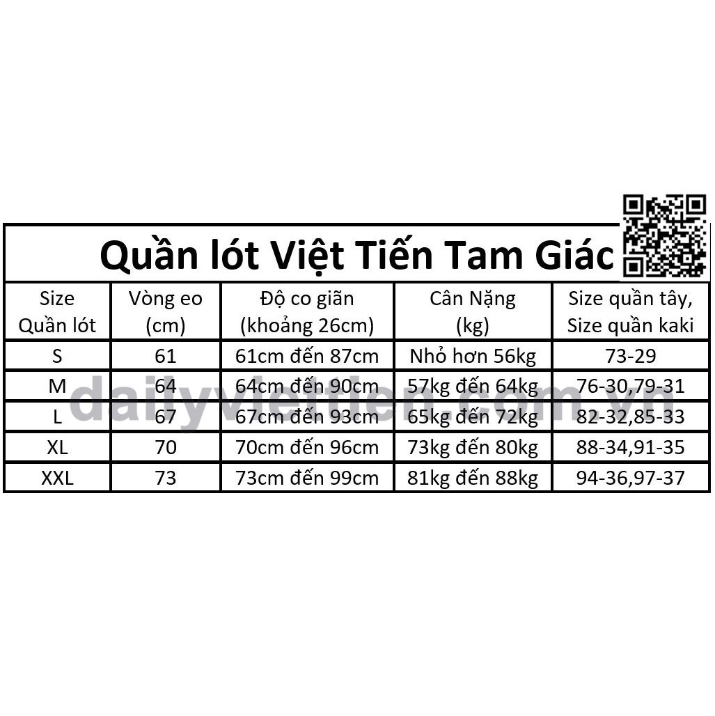 MIỄN PHÍ GIAO HÀNG khi mua từ 2 quần lót Việt Tiến Tam Giác Brief màu Xanh Dương Tối D.Blue số 586 hoặc mua cùng sản phẩm khác. Size quần được tư vấn trên hình từ size S đến size XXL, nếu mua cho người lớn tuổi hoặc muốn mặc rộng có thể tăng lên 1 size.