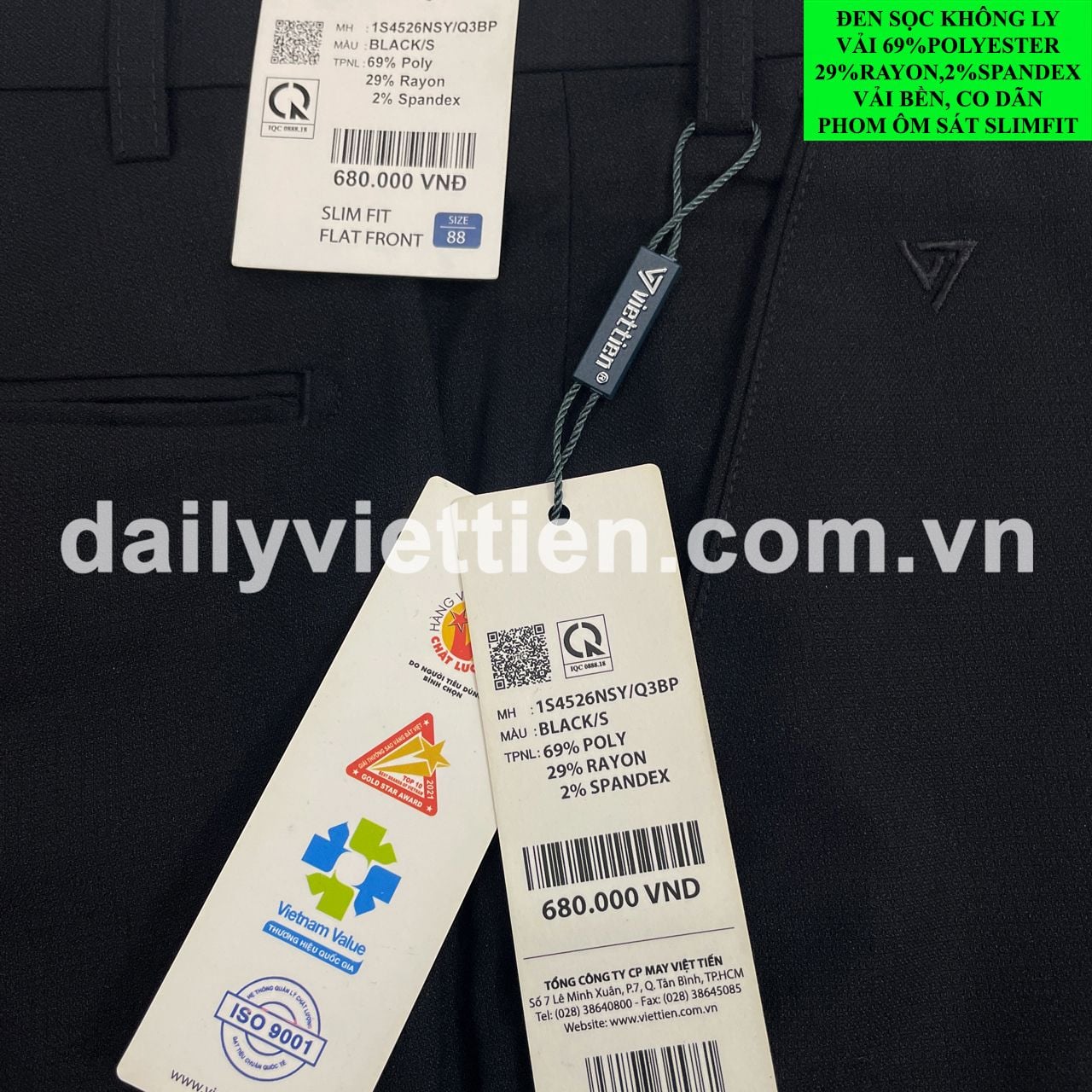 Quần tây Đen Sọc Slim Fit Không ly Việt Tiến số 931.